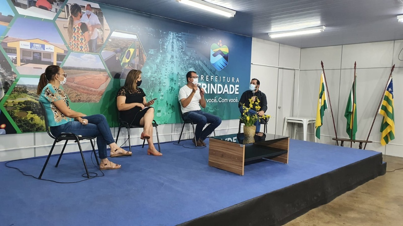 Participaram o secretário municipal de Educação, Sérgio Sanches, o diretor de Vigilância em Saúde da SMS, Leonardo Izidório, e a superintendente de Ensino e Gestão Pedagógica da SME, Virgínia Bonfanti, com mediação feita pela jornalista Lyra Rúbia, da equipe da Agência de Comunicação (Agecom) de Trindade.