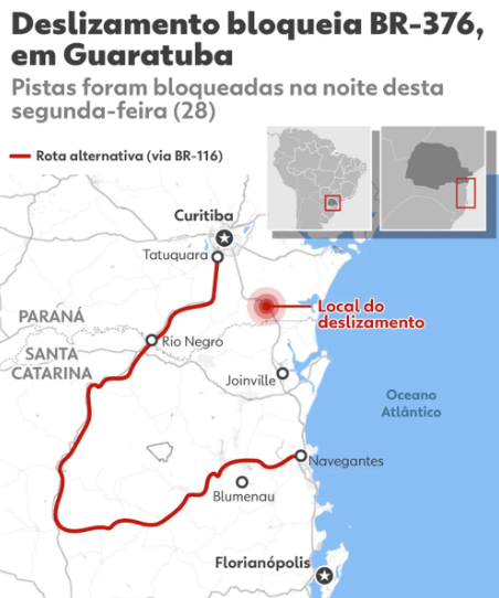 A ligação entre o Paraná e Santa Catarina pela BR-376 está interditada e, por conta do deslizamento, polícia e concessionária estabeleceram bloqueios de segurança. Até a última atualização desta reportagem, eram eles: