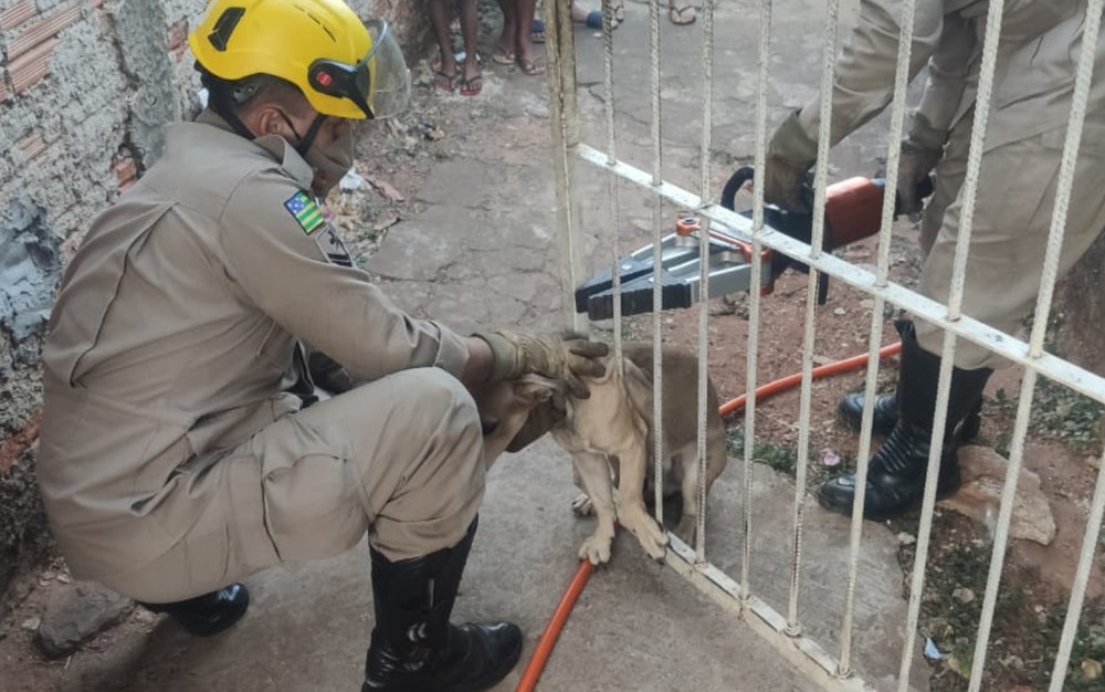 Bombeiros resgatam cachorro que ficou preso entre grades de portão em Goiânia
