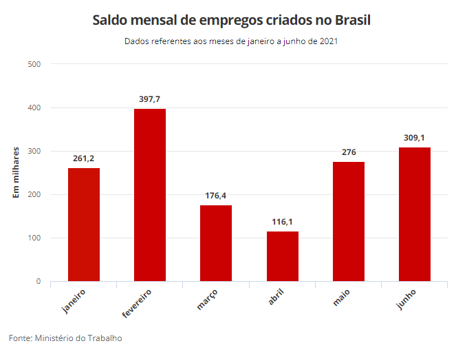 Em junho, ainda segundo dados do Caged, o Brasil criou 309.114 mil empregos formais, resultado da diferença entre as contratações, que somaram 1.601.001, e as demissões, que totalizaram 1.291.887 no mês passado.
