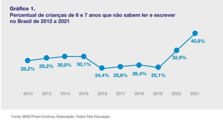 Um levantamento do Todos Pela Educação indica que, entre 2019 e 2021, houve um aumento de 66,3% no número de crianças de 6 e 7 anos de idade no Brasil que, segundo os responsáveis, não sabem ler e escrever. O número subiu de 1,4 milhão em 2019 para 2,4 milhões em 2021.