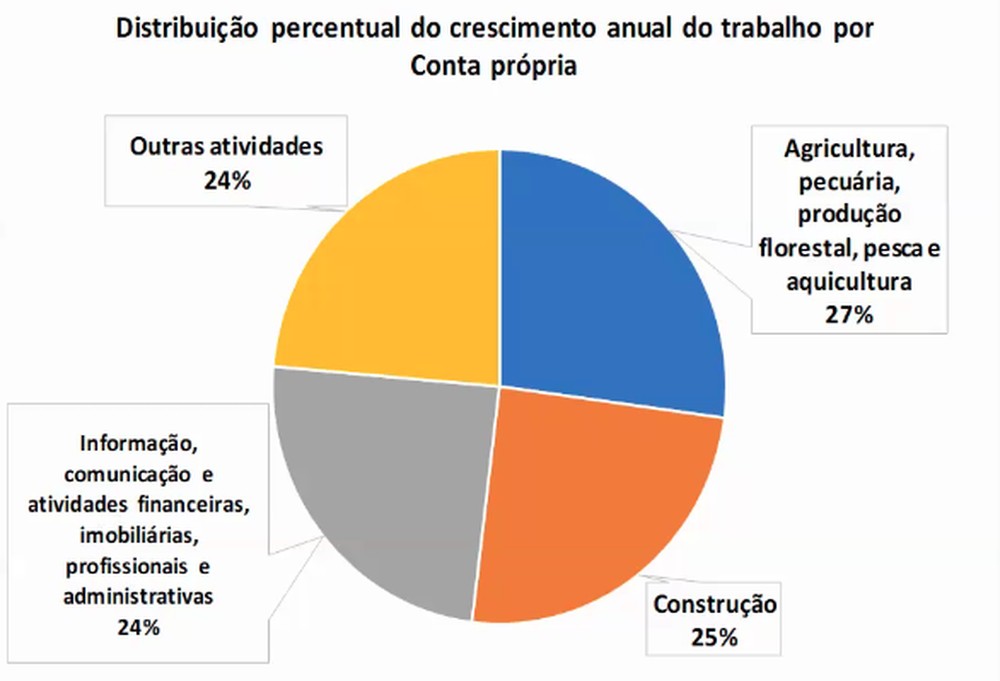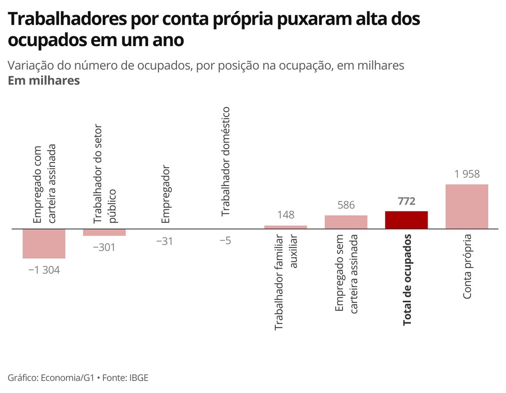 O aumento da ocupação se deu, exclusivamente, puxado pelos trabalhadores por conta própria, única categoria profissional que cresceu no período, tendo registrado um avanço de 3% na comparação com o trimestre terminado em fevereiro.