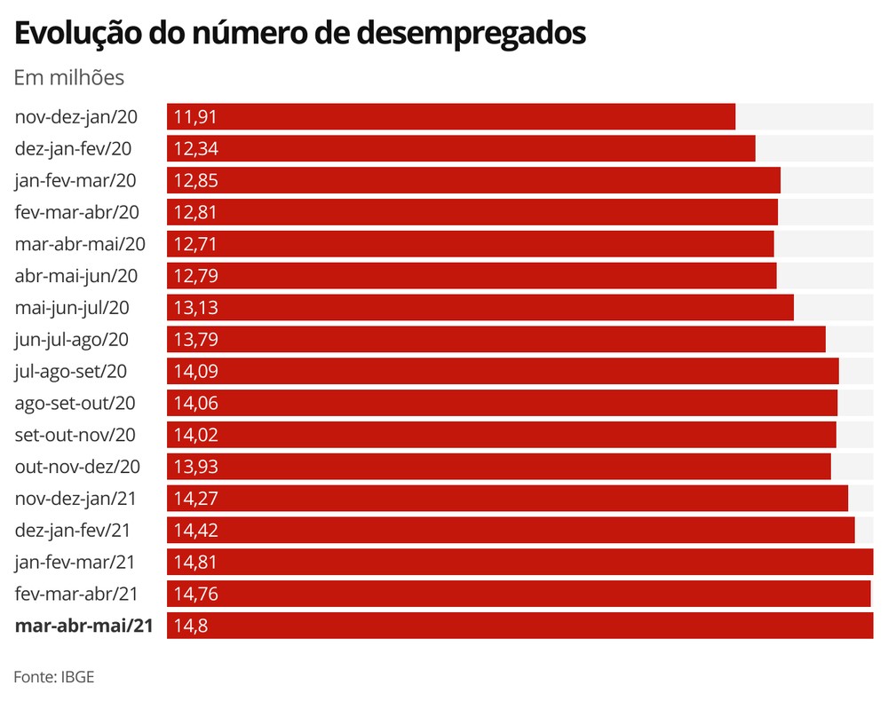 • 14,8 milhões de desempregados (2 milhões a mais que em maio de 2020): pessoas que não trabalham, mas procuraram empregos nos últimos 30 dias;