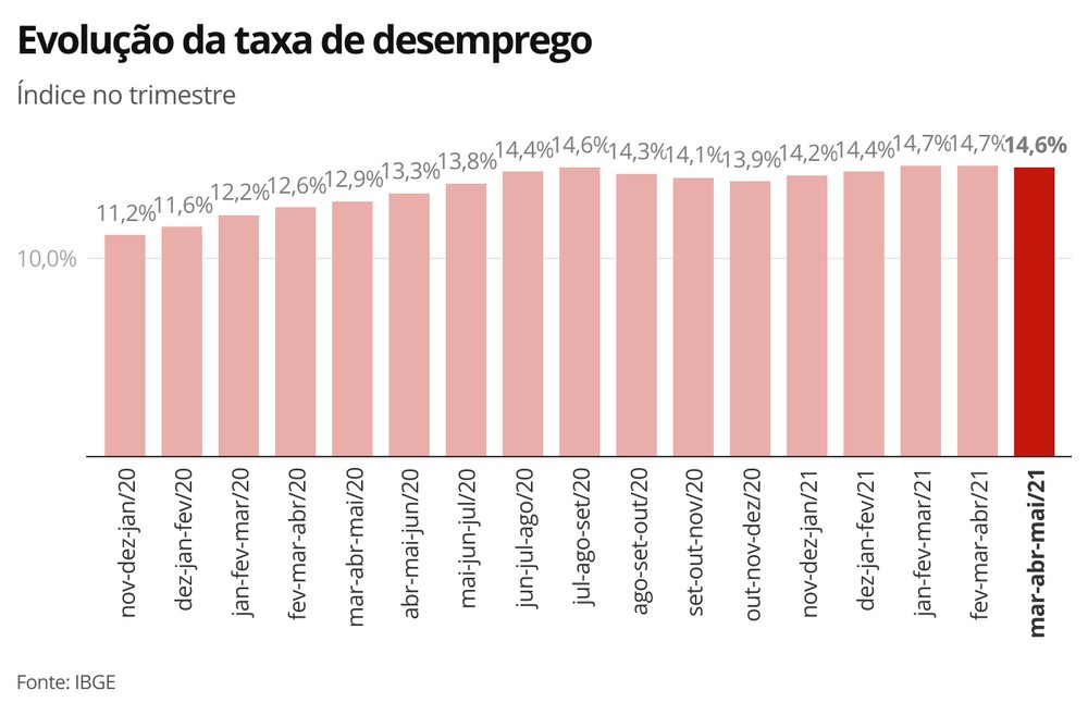 A taxa de desemprego no Brasil ficou em 14,6% no trimestre encerrado em maio, apontam os dados divulgados nesta sexta-feira (30) pelo Instituto Brasileiro de Geografia e Estatística (IBGE). Isso representa um contingente de 14,8 milhões de pessoas buscando por uma oportunidade no mercado de trabalho no país.