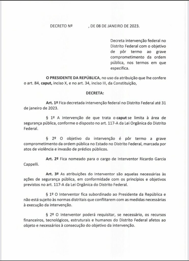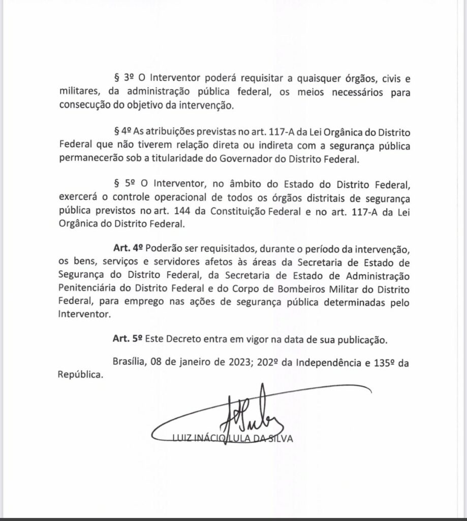 O decreto vale até o dia 31 de janeiro, com o objetivo de conter o grave comprometimento da ordem pública. “Aquelas pessoas invadiram a sede do Congresso, o STF e o Planalto como verdadeiros vândalos, destruindo tudo o que encontravam pela frente”, afirmou o presidente.