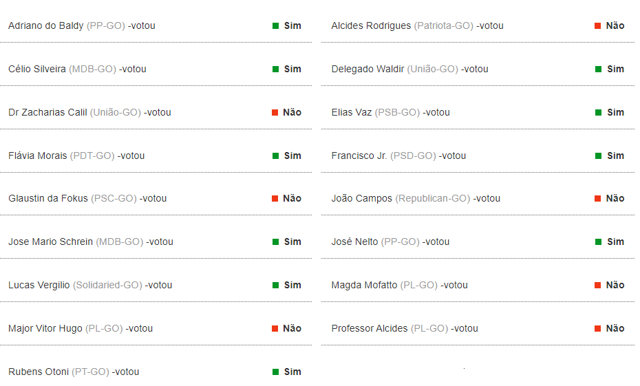 Os goianos contrários à PEC foram Alcides Rodrigues (Patriota), Zacharias Calil (União Brasil), Glaustin da Fokus (PSC), João Campos (Republicanos), Magda Mofatto (PL), Major Vitor Hugo (PL) e Professor Alcides (PL).