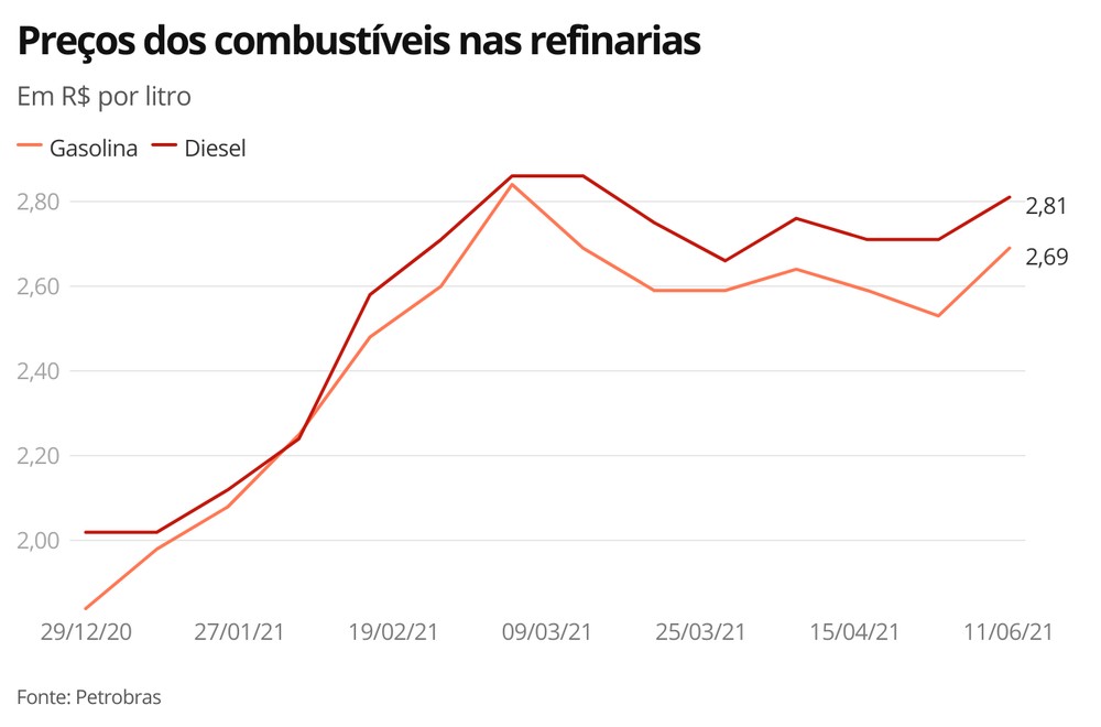Os preços médios de venda de gasolina e diesel da Petrobras para as distribuidoras passarão a ser de R$ 2,69 e R$ 2,81 por litro, o que significa reajustes médios de R$ 0,16 (6,3%) e R$ 0,10 por litro (3,7%), respectivamente.