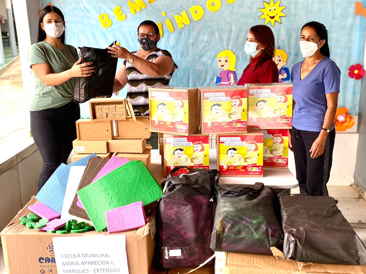 Além do material pedagógico, também tem sido entregue nas escolas municipais muitas peças de mobiliário, como carteiras e mesas novas, mesas de refeitório, armários, geladeiras, entre outros.