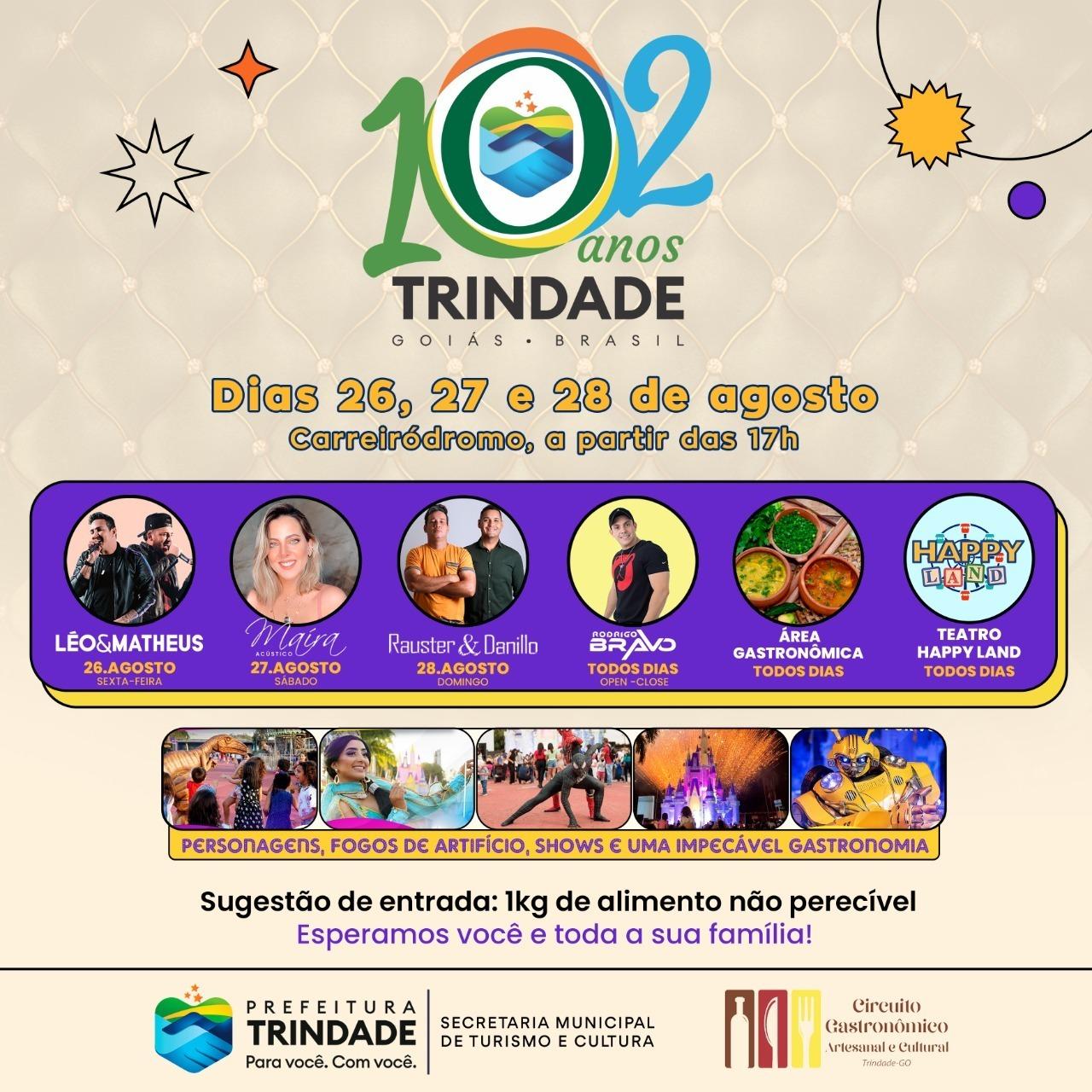 Shows todos os dias, área de gastronomia e o Teatro Happy Land da Disney, com vários tipos de diversão nos dias 26, 27 e 28 (sexta, sábado e domingo desta semana). Esta programação é a base do Circuito Cultural e Gastronômico 102 Anos de Trindade, oferecido pela Prefeitura no Carreiródromo, a partir das 17h.