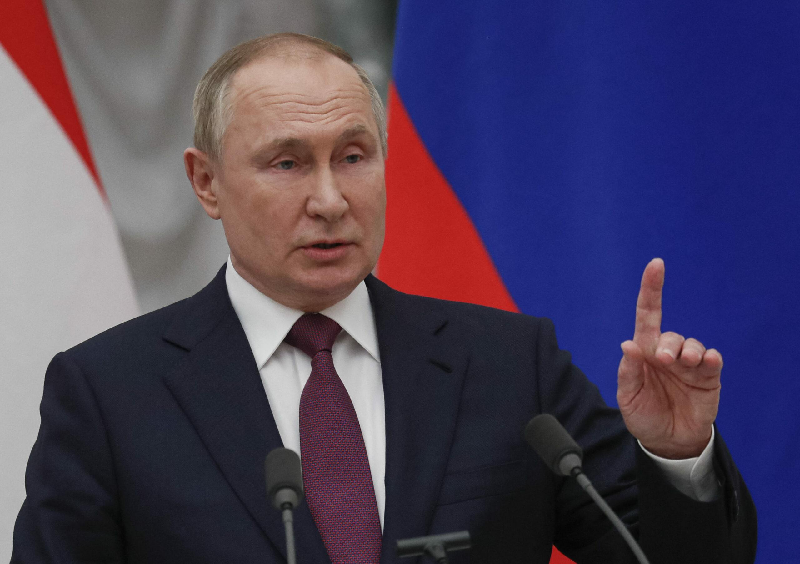 Russian President Vladimir Putin talks during a press conference with Hungarian Prime Minister after their meeting at the Kremlin in Moscow on February 1, 2022. (Photo by YURI KOCHETKOV / POOL / AFP)