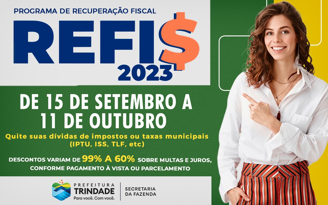 A Prefeitura de Trindade abre, no dia 15 de setembro, a segunda edição do Programa de Recuperação Fiscal (Refis) 2023. O prazo vai até 11 de outubro. Os contribuintes com dívidas tributárias junto ao município (ISS, TLF, IPTU, ITU, entre outros) terão opções para que possam aderir ao benefício. Os descontos em multas e juros de débitos fiscais variam de 99% a 60%. O pagamento pode ser parcelado em até 36 vezes.