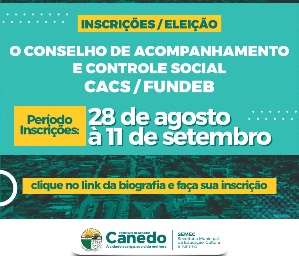 A Prefeitura de Senador Canedo, por meio da Secretaria Municipal de Educação, Cultura e Turismo, anuncia a abertura das inscrições para a composição civil do Conselho CACS/FUNDEB, no período de 28 de agosto a 11 de setembro.
