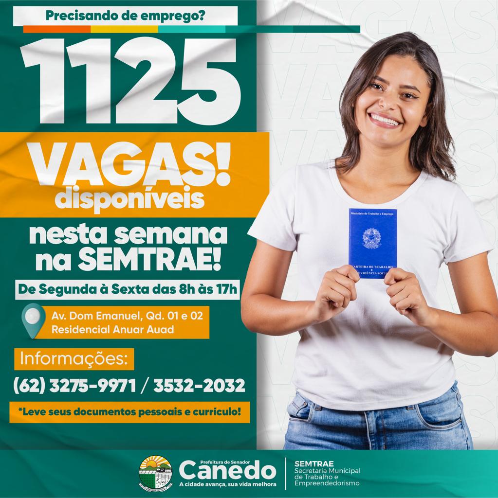 A prefeitura de Senador Canedo, por meio da Secretaria de Trabalho e Empreendedorismo (Semtrae), oferece durante essa semana, 1125 vagas de trabalho para os cidadãos canedenses.