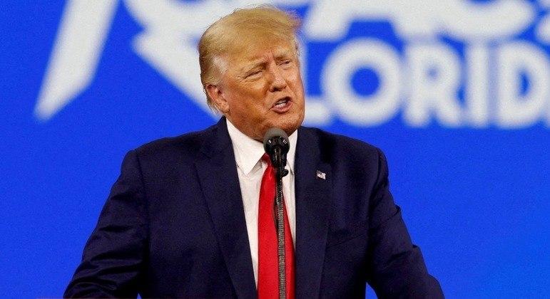 O ex-presidente dos EUA Donald Trump fala durante conferência em Orlando, na Flórida